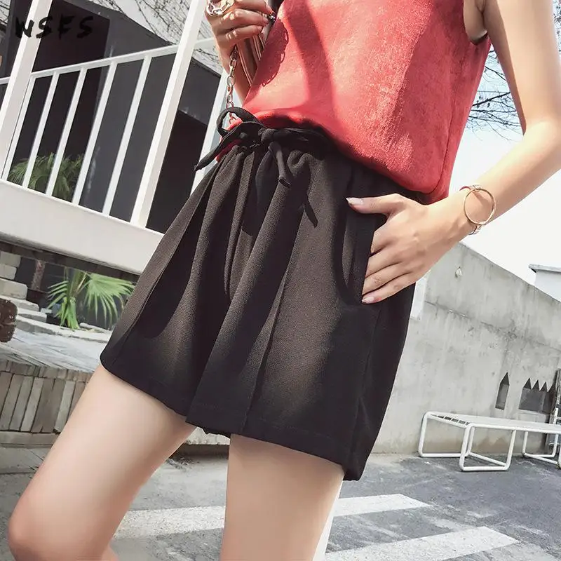 Images of Hot Ladies Shorts Women Summer Chiffon Shorts Ladies Wide Leg Short Trousers Black Red Khaki Loose Womens High Waist Trouser :