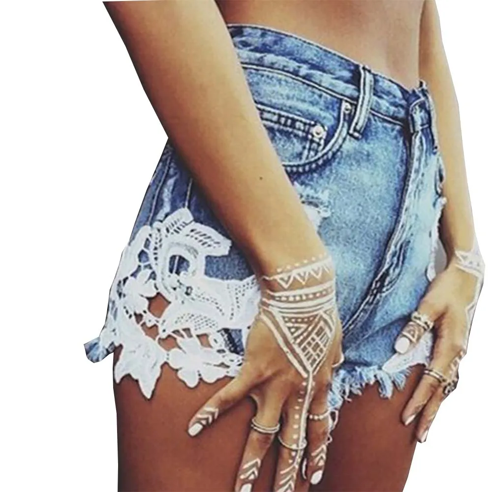 Images of Lace Splice Women Denim Shorts High Waist Summer Hotpants Thong Ripped Tassel Jeans Short feminino Vintage Slim Shorts Plus Size :