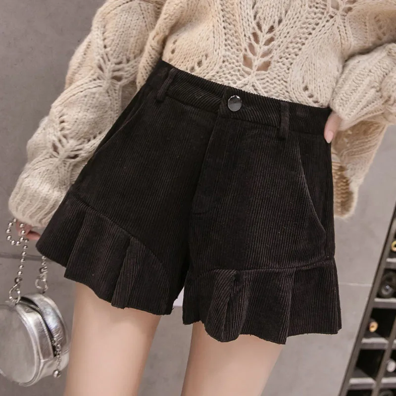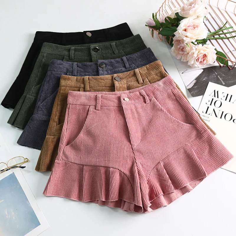 Best Offer Korean High Waist Corduroy Shorts Women Autumn Winter Loose Wide Leg Ruffle Bottom Plus Size Cute Solid Outerwear Pink Shorts