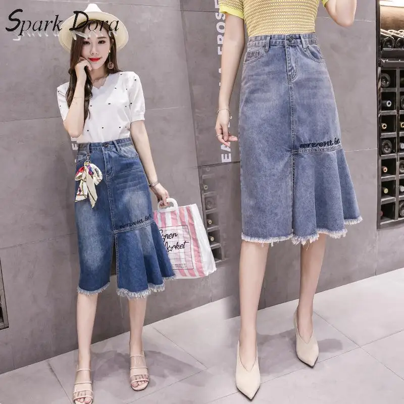 Sale SparkDora New Patchwork Skirts Denim Womens Blue Summer Female Skirt Sexy Split Letter Embroidered Jeans Woman Skirts Plus Size