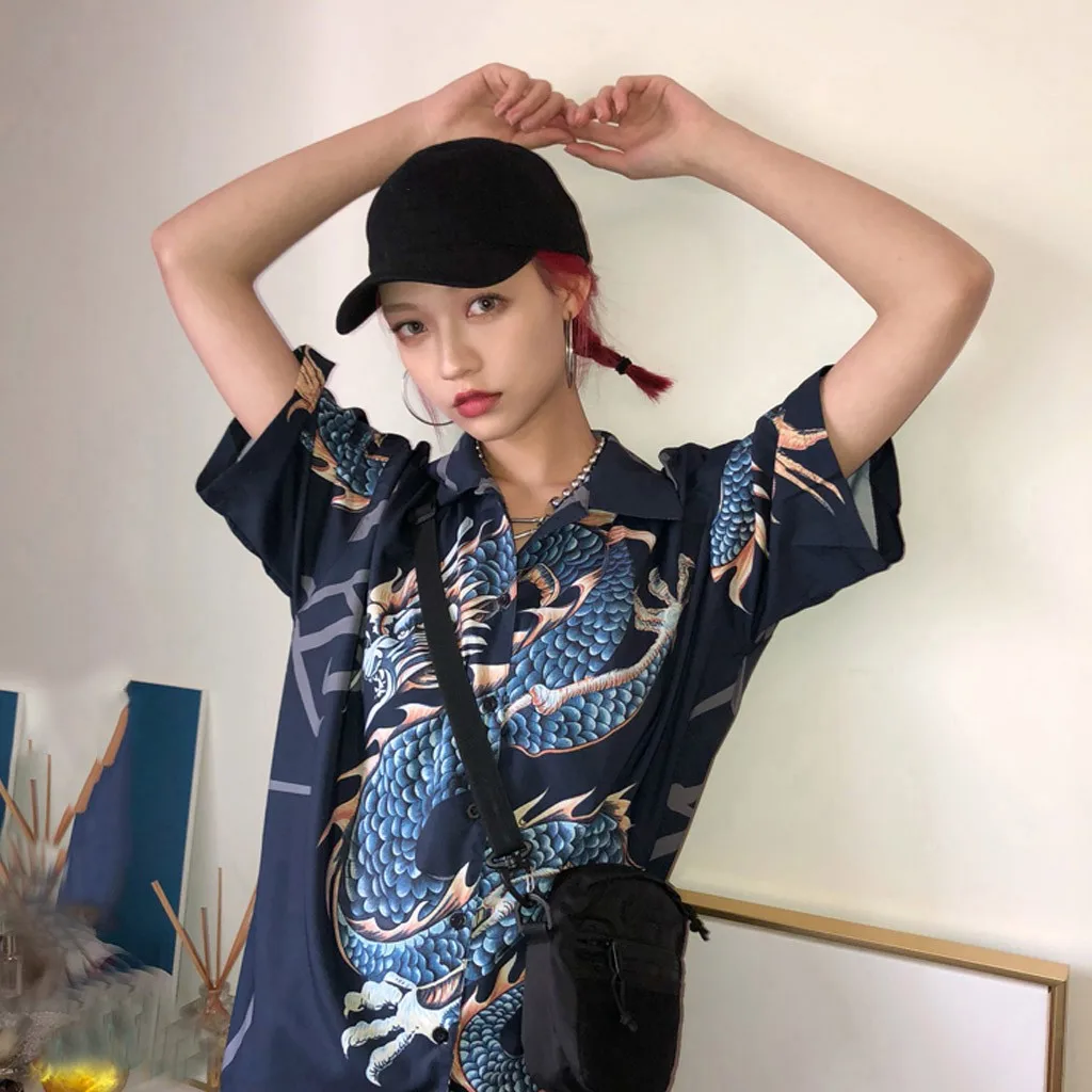 Best Offer Dragon Print Blouses for Women Turn Down Collar Half Sleeve Printed Buttons Up Shirts Tops Casual Women Blouses Chemisier Femme